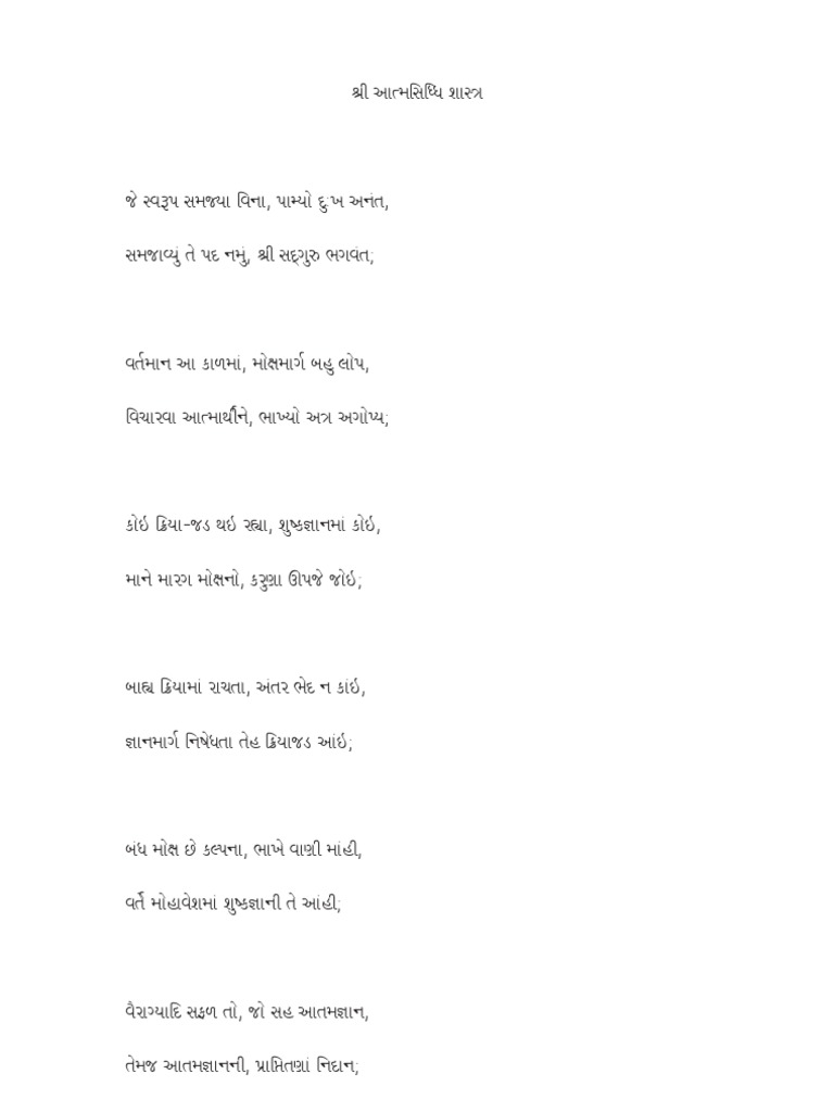 Je swarup samjya vinaSeve sadguru charan ne Set of CDs Types. ATMASIDDHI SHASTRA GUJARATI PDF - Following a request from Shree Saubhagbhai of Sayla Shrimad Rajchandra composed the great Atma Sidhi Shastra in the town of Nadiad Gujarat. Atmasiddhi Shastra Its Composition.