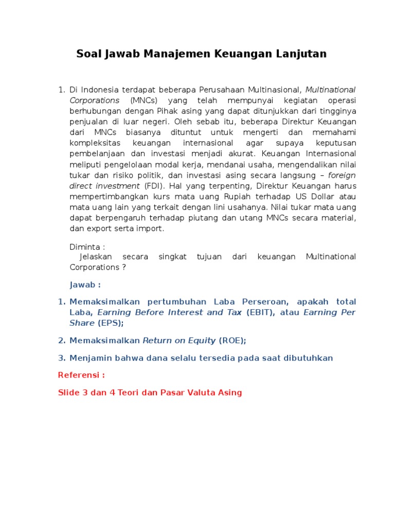 107 soal dan jawaban seputar manajemen keuangan internasional disusun oleh. 20190203 107 soal dan jawaban seputar Manajemen Keuangan Internasional Disusun Oleh. Manajemen keuangan internasional penting tidak hanya bagi MNC besar dengan sejumlah anak perusahaan asing tetapi juga untuk perusahaan yang menjalankan bisnis internasional.