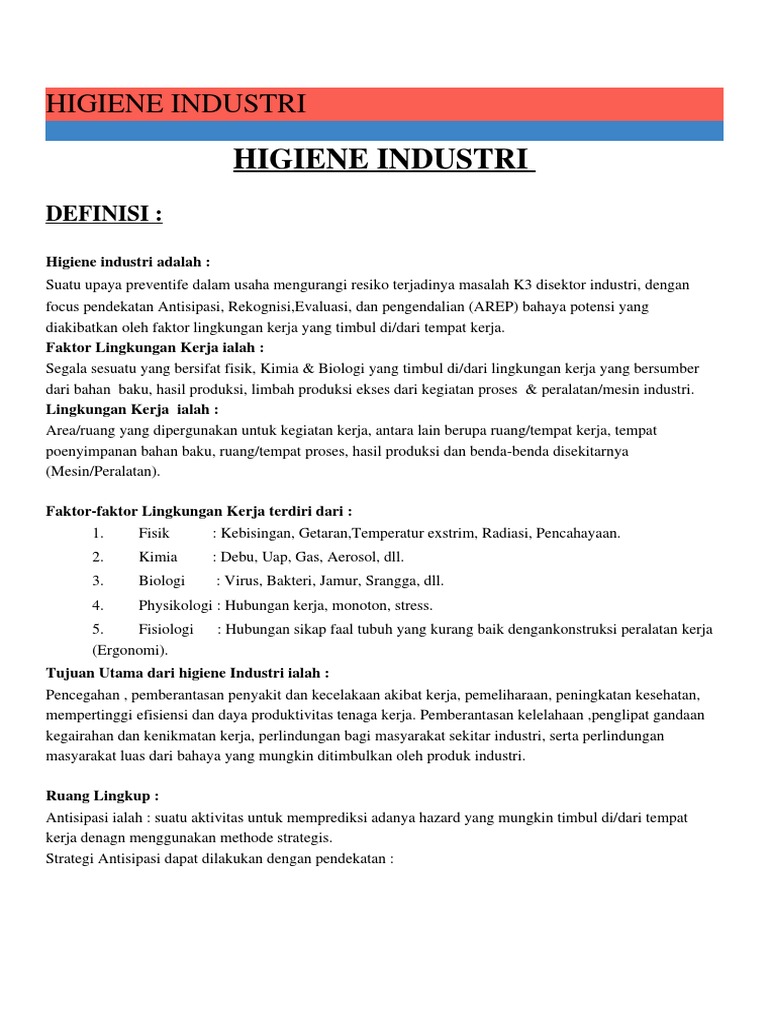 Definisi Higiene Industri Definisi Higiene Industri Spesialisasi Dalam Ilmu Higiene Beserta Prakteknya Pdf Document